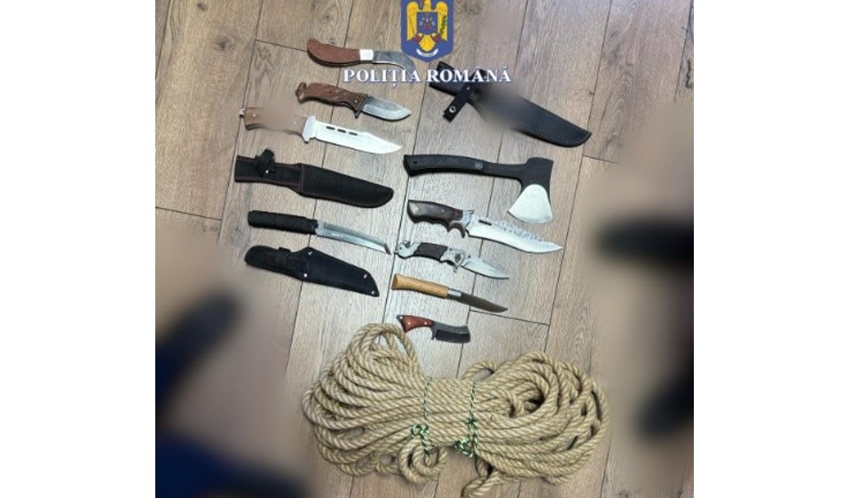 Opt cuțite, un topor, funie și o stea ascuțită, în camera de cămin a unui student! Armele albe au fost confiscate de polițiști, iar tânărul s-a ales cu dosar penal