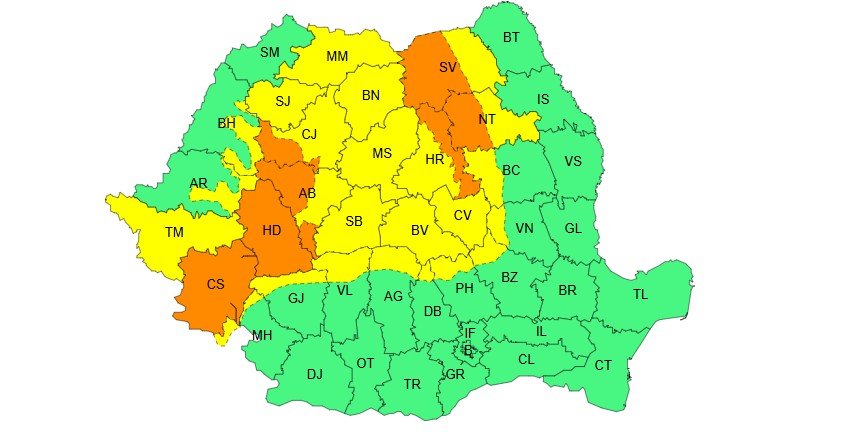 De asemenea, în județele Caraș Severin și Hunedoara, precum și în zona montană a județelor Cluj, Alba, Suceava, Neamț și Harghita vor fi averse însemnate cantitativ, frecvente descărcări electrice și pe arii restrânse intensificări puternice ale vântului (rafale de 70…90 km/h) și grindină de medii și posibil mari dimensiuni (3 – 5 cm). În intervale scurte de timp sau prin acumulare, cantitățile de apă vor fi de 40…50 l/mp și izolat de peste 60 l/mp.
