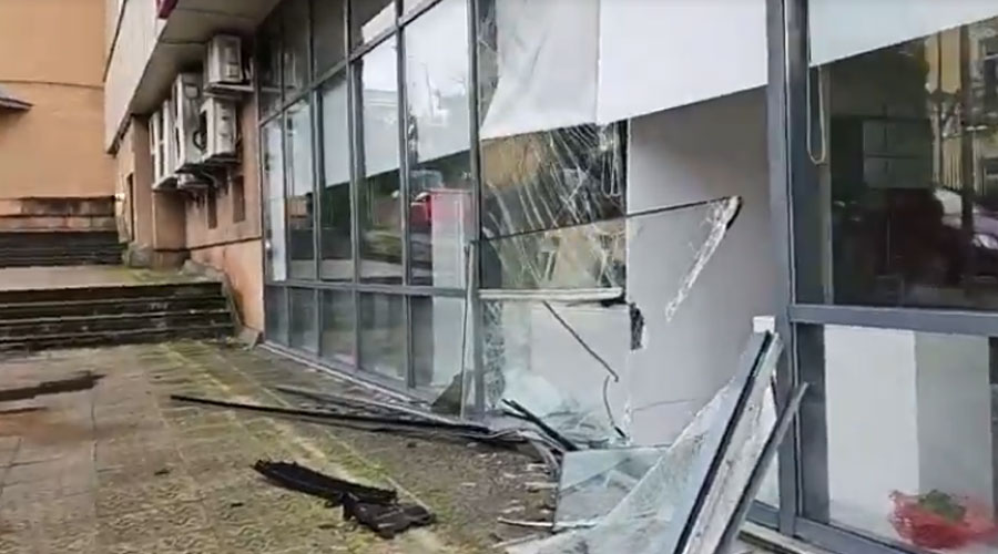A fost distrus un indicator rutier, dar şi peretele din sticlă al agenţiei bancare, în care s-a oprit, în cele din urmă, maşina scăpată de sub control.