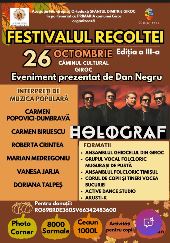 Comunitatea din Giroc și nu numai este invitată să celebreze toamna și spiritul generozității la Festivalul Recoltei – Ediția a III-a.