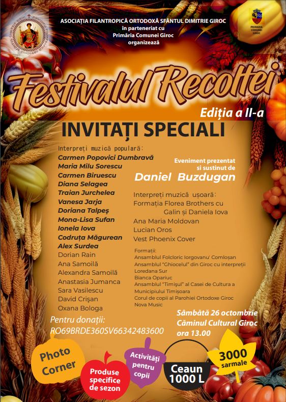 Asociația Filantropicǎ Ortodoxă „Sfântul Dimitrie” din Giroc, în parteneriat cu Primăria Giroc organizează sâmbătă, 26 octombrie, a doua ediție a „Festivalului Recoltei”. Evenimentul caritabil cu strângere de fonduri pentru persoanele nevoiașe din comună va avea loc începând cu ora 13, la Căminul Cultural din Giroc.
