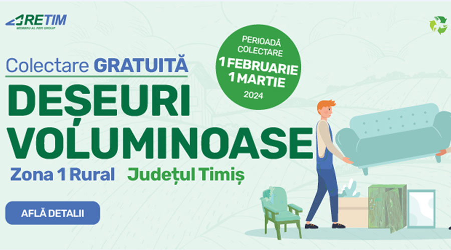 Compania RETIM împreună cu ADID Timiș anunță începerea campaniei de colectare gratuită a deșeurilor voluminoase din Zona 1 rural a județului Timiș ce va avea loc în perioada 01 februarie – 01 martie 2024.