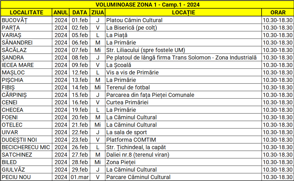 Cetățenii din localitățile menționate mai sus pot depune prin aport voluntar și gratuit deșeurile voluminoase în containerele special puse la dispoziție în punctele de colectare și între orele menționate în tabelul de mai jos.