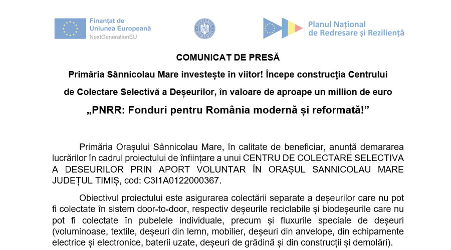 Primăria Orașului Sânnicolau Mare, în calitate de beneficiar, anunță demararea lucrărilor în cadrul proiectului de înființare a unui CENTRU DE COLECTARE SELECTIVA A DESEURILOR PRIN APORT VOLUNTAR ÎN ORAȘUL SANNICOLAU MARE JUDEȚUL TIMIȘ, cod: C3I1A0122000367.