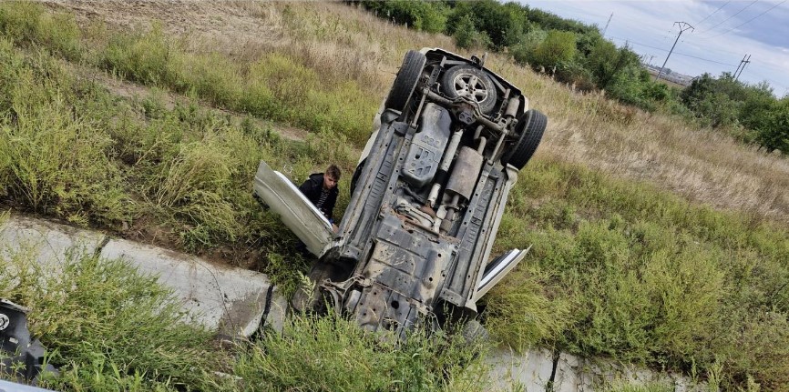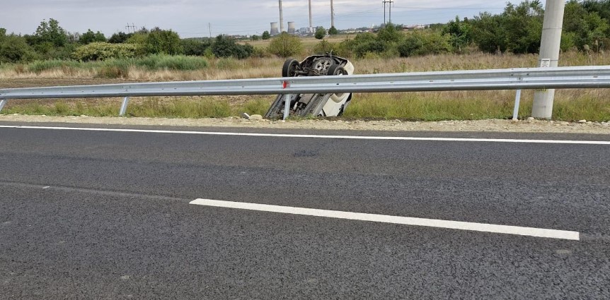 Mașina a trecut de gardul de protecție și a ajuns cu roțile în sus, în șanțul de pe marginea drumului.