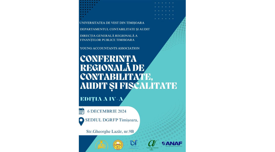 Departamentul Contabilitate și Audit din cadrul Universității de Vest din Timișoara organizează, în parteneriat cu Direcția Generală Regională a Finanțelor Publice Timișoara, Camera Auditorilor Financiari din România, Camera Consultanților Fiscali și Young Accountants Association, Conferința Regională de Contabilitate, Audit și Fiscalitate (ediția a IV-a).