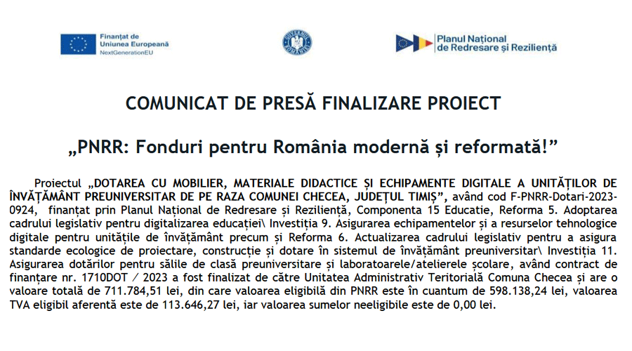 Proiectul „DOTAREA CU MOBILIER, MATERIALE DIDACTICE ȘI ECHIPAMENTE DIGITALE A UNITĂȚILOR DE ÎNVĂȚĂMÂNT PREUNIVERSITAR DE PE RAZA COMUNEI CHECEA, JUDEȚUL TIMIȘ”, având cod F-PNRR-Dotari-2023- 0924, finanțat prin Planul Național de Redresare și Reziliență, Componenta 15 Educatie, Reforma 5. Adoptarea cadrului legislativ pentru digitalizarea educației\ Investiția 9. Asigurarea echipamentelor și a resurselor tehnologice digitale pentru unitățile de învățământ precum și Reforma 6. Actualizarea cadrului legislativ pentru a asigura standarde ecologice de proiectare, construcție și dotare în sistemul de învățământ preuniversitar\ Investiția 11. Asigurarea dotărilor pentru sălile de clasă preuniversitare și laboratoarele/atelierele școlare, având contract de finanțare nr. 1710DOT ⁄ 2023 a fost finalizat de către Unitatea Administrativ Teritorială Comuna Checea și are o valoare totală de 711.784,51 lei, din care valoarea eligibilă din PNRR este în cuantum de 598.138,24 lei, valoarea TVA eligibil aferentă este de 113.646,27 lei, iar valoarea sumelor neeligibile este de 0,00 lei.