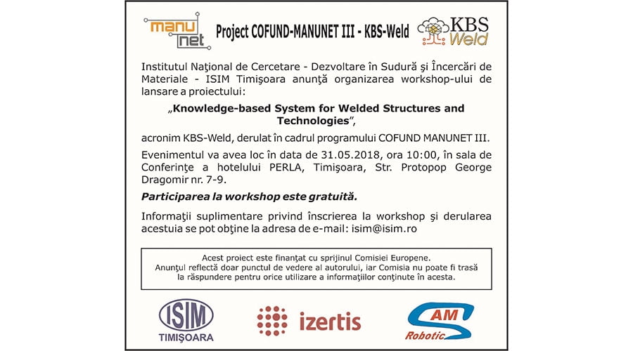 Institutul Naţional de Cercetare – Dezvoltare în Sudură şi Încercări de Materiale – ISIM Timişoara anunţă organizarea workshop-ului de lansare a proiectului: