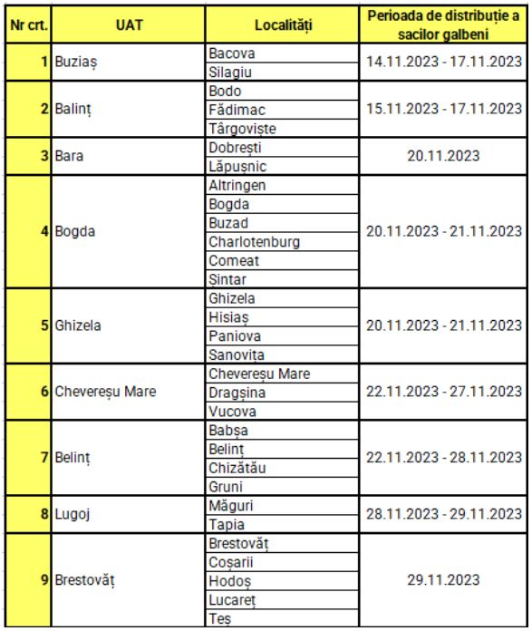 Iată însă, localitățile în care se distribuie saci galbeni în luna noiembrie:
