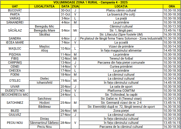Cetățenii din localitățile menționate mai sus pot preda gratuit prin aport voluntar deșeurile voluminoase la punctele special amplasate conform tabelului de mai jos.