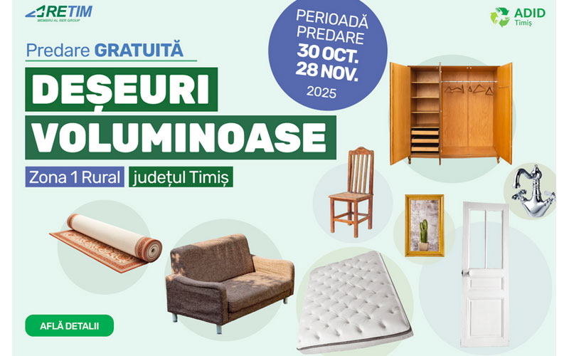 În perioada 30 octombrie – 28 noiembrie, în Zona 1 Rural, Timiș, RETIM Ecologic Service S.A. împreună cu ADID Timiș, organizează ultima campanie de predare gratuită a deșeurilor voluminoase din 2025.