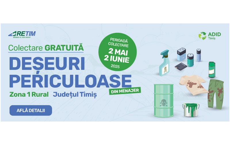 RETIM și ADID Timiș demarează a doua campanie, din acest an, pentru colectarea gratuită a deșeurilor periculoase din menajer, în Zona 1 Rural!