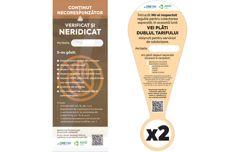 RETIM Ecologic Service S.A. și Asociația de Dezvoltare Intercomunitară Deșeuri Timiș (ADID Timiș) anunță reluarea aplicării etichetelor pentru nerespectarea regulilor de colectare separată începând cu data de 01 octombrie 2025.
