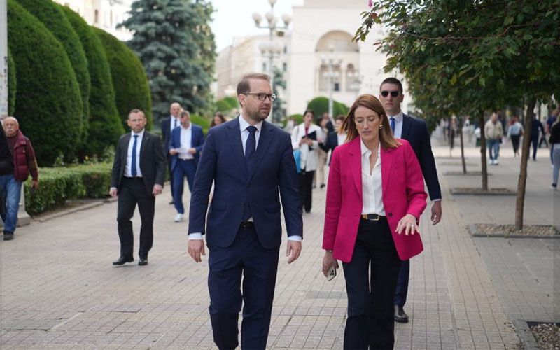Președinta Parlamentului European a fost întâmpinată de primarul Dominic Fritz, care a însoțit-o într-o scurtă plimbare prin oraș.