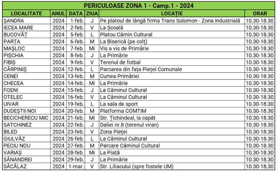 Campanie de colectare gratuită a deșeurilor periculoase din menajer din Zona 1 rural a judeţului Timiş se va desfășura în localitățile: Șandra, Iecea Mare, Bucovăț, Parța, Mașloc, Pișchia, Fibiș, Cărpiniș, Cenei, Checea, Foeni, Otelec, Uivar, Dudeștii Noi, Becicherecu Mic, Satchinez, Biled, Giulvăz, Peciu Nou, Variaș, Sânandrei și Săcălaz.