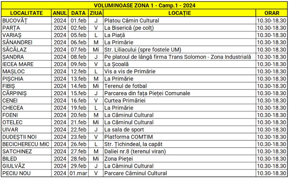 În ceea ce privește colectare gratuită a deșeurilor voluminoase din Zona 1 rural a județului Timiș, vizate sunt următoarele localități: Bucovăț, Parța, Variaș, Sânandrei, Săcălaz, Șandra, Iecea Mare, Mașloc, Pișchia, Fibiș, Cărpiniș, Cenei, Checea, Foeni, Otelec, Uivar, Dudeștii Noi, Becicherecu Mic, Satchinez, Biled, Giulvăz și Peciu Nou.