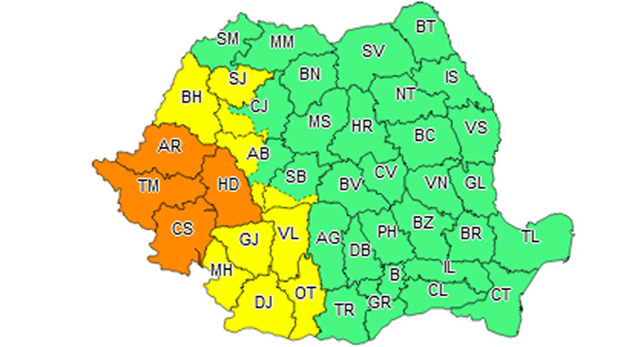 Vizate sunt judeţele Timiş, Caraş-Severin, Arad şi Hunedoara, unde meteorologii anunţă ploi torenţiale şi vânt puternic.