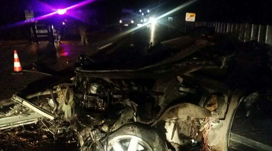 Impactul a fost atât de puternic, încât șoferul și un pasager de 19 ani au fost aruncați la cațiva metri distanță de autoturismul distrus.