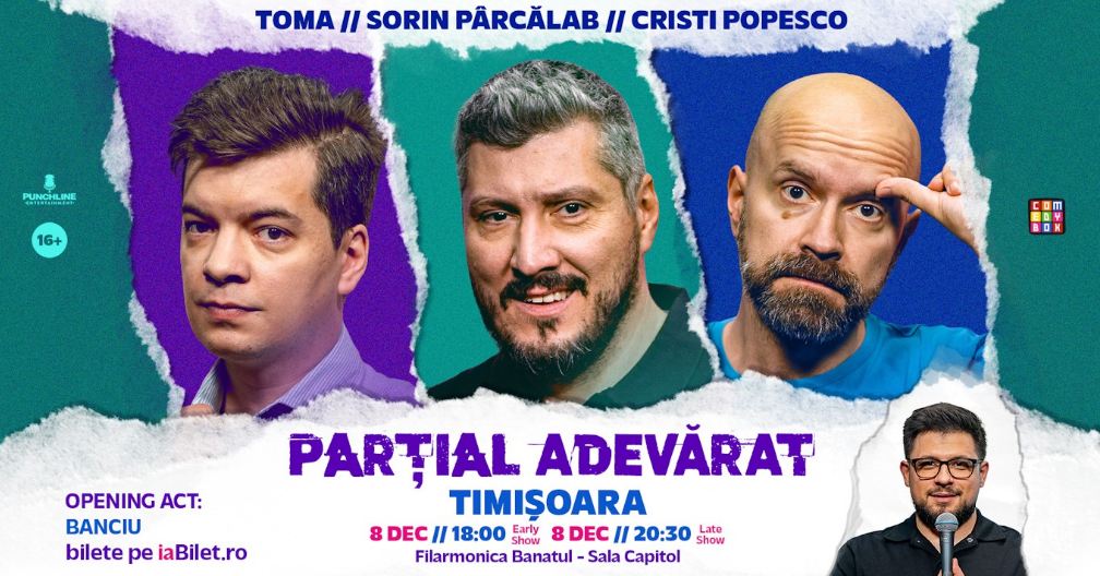 Sorin Pârcălab, Toma și Cristi Popesco vin la Timișoara cu spectacolul de stand-up comedy – „Parțial Adevărat”! Au mai rămas doar câteva locuri disponibile!