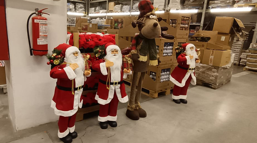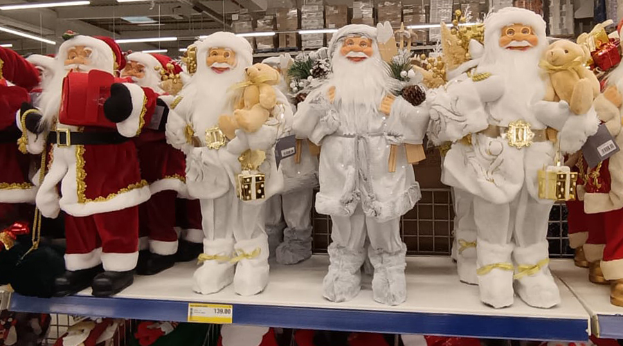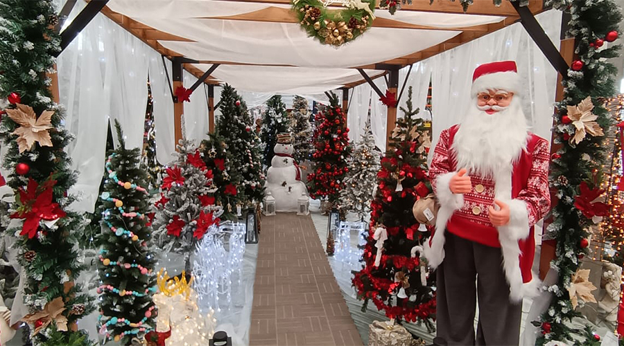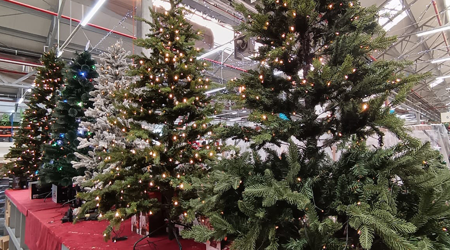 Brazii artificiali, în toate formele și dimensiunile, se aliniază frumos în fața clienților nerăbdători, în timp ce figurinele Moș Crăciun și renii lui veghează din rafturi.