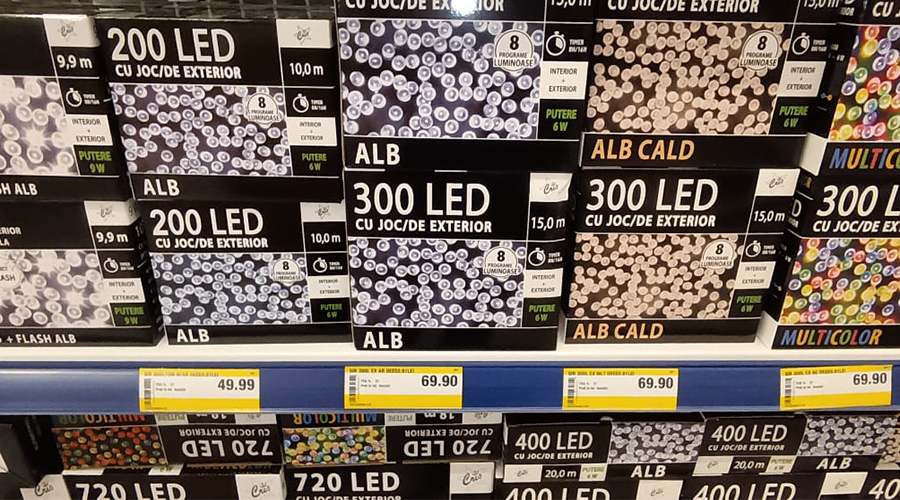 Globurile sclipitoare, beteala colorată și instalațiile luminoase creează o atmosferă de sărbătoare încă de la intrarea în magazin.