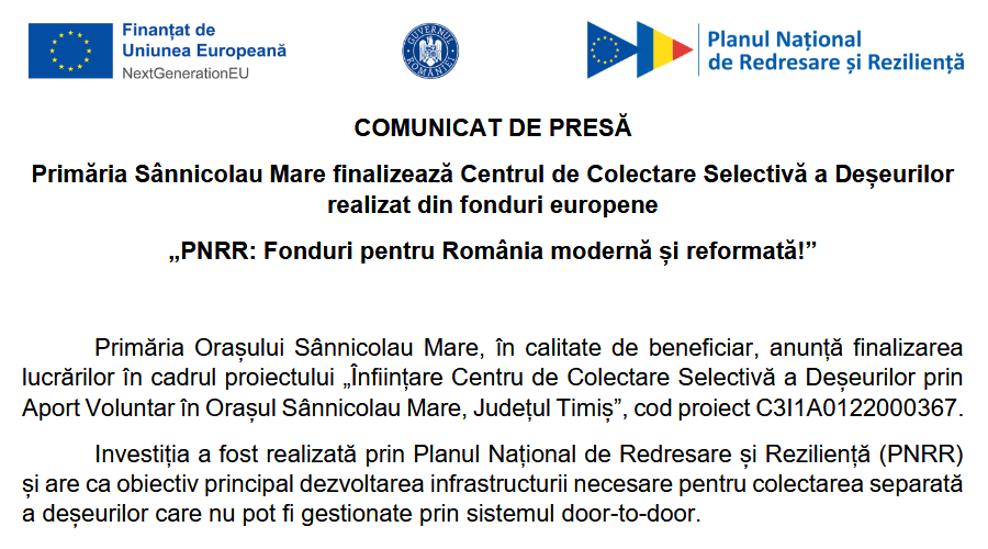 Primăria Sânnicolau Mare finalizează Centrul de Colectare Selectivă a Deșeurilor realizat din fonduri europene – „PNRR: Fonduri pentru România modernă și reformată!”