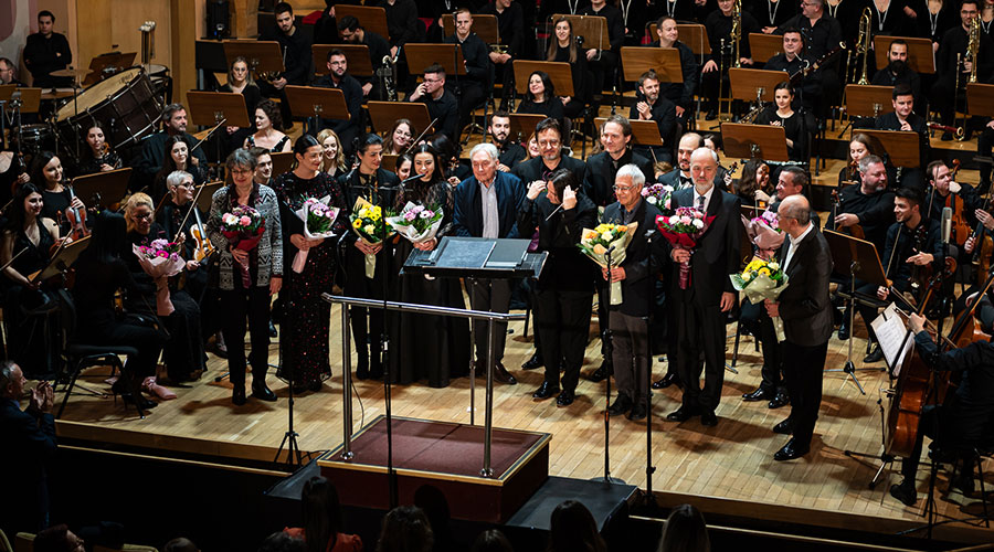 Publicul aflat în picioare i-a aplaudat intens și pe cei șapte compozitori, care, la finalul concertului, au urcat pe scenă alături de artiști.