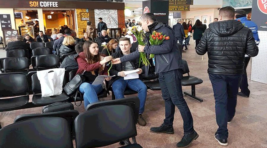 Cu ocazia zilei de 8 Martie, cele ce au călătorit cu avionul au avut parte la Aeroportul Timişoara de o surpriză plăcută. Angajaţii le-au întâmpinat cu flori şi felicitări.