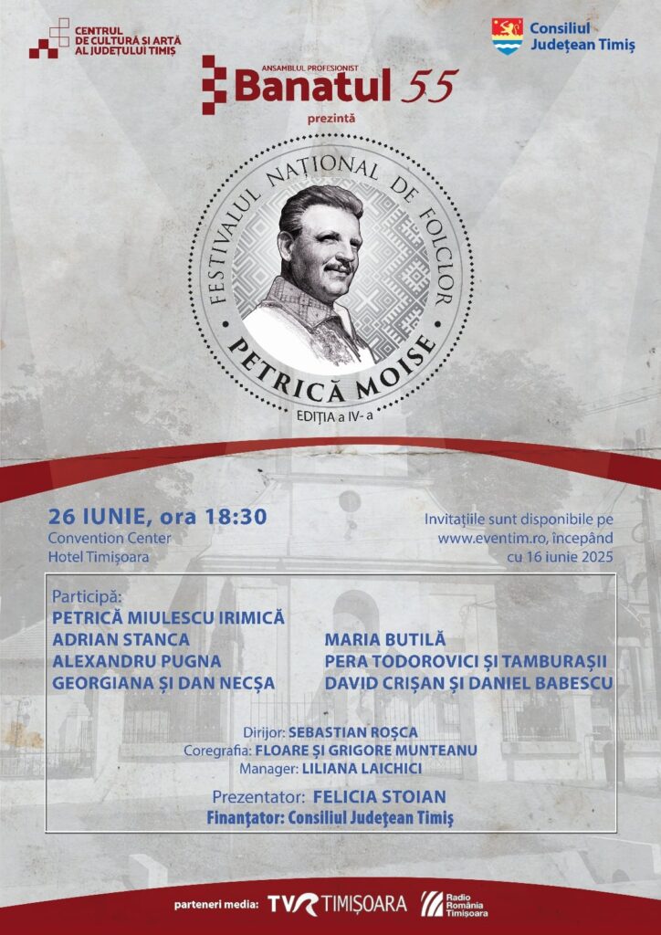 Centrul de Cultură și Artă al Județului Timiș organizează cea de-a patra ediție a Festivalului Național de Folclor „Petrică Moise”, un eveniment de suflet dedicat memoriei unuia dintre cei mai iubiți artiști ai Banatului.