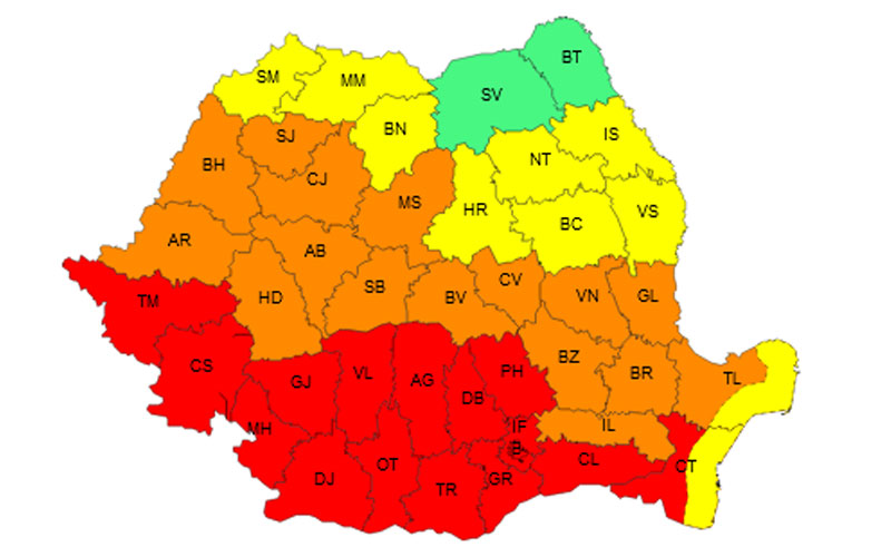 De asemenea, Crișana, cea mai mare parte a Transilvaniei, nord-estul și estul Munteniei, sudul Moldovei și nordul Dobrogei continentale, vor fi sub incidența unui cod portocaliu de caniculă. Temperaturile maxime se vor încadra între 35 și 39 de grade, iar minimele termice vor fi de 18-22 de grade.