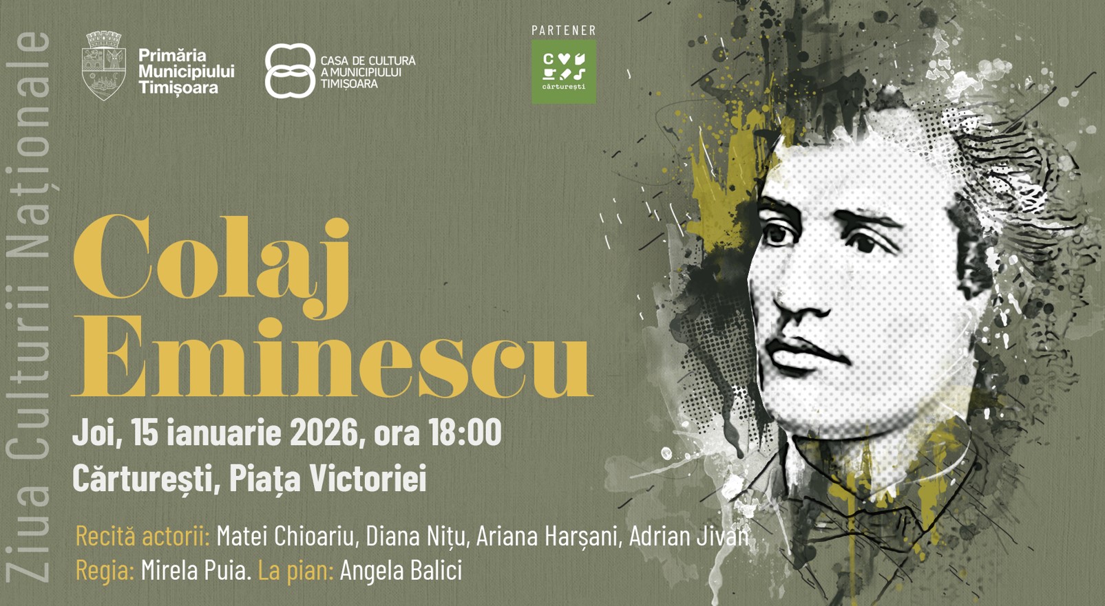 Tot în data de 15 ianuarie, de la ora 18:00, spectacolul „Colaj Eminescu” va fi prezentat și la librăria Cărturești din Piața Victoriei, într-o versiune adaptată spațiului. Evenimentul va fi acompaniat la pian de Angela Balici, pianist corepetitor al Operei Naționale Române din Timișoara. Regia este semnată de Mirela Puia, iar distribuția îi include pe actorii Matei Chioariu, Diana Nițu, Ariana Harșani și Adrian Jivan.