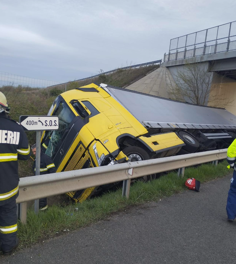 Accident pe autostrada vestului! Un tir încărcat cu marfă s-a răsturnat în afara carosabilului.