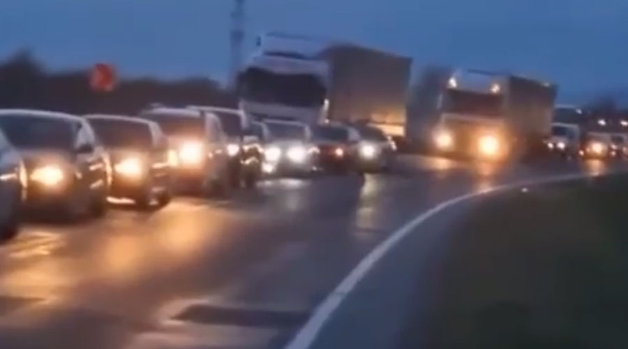 Cozile de maşini se întind pe 80 de kilometri, pe ambele sensuri de mers, din cauza resctricţiilor de viteză de 30 km/oră.