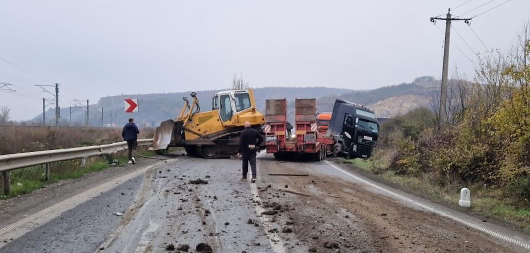 Accident grav, petrecut în urmă cu puțin timp pe o șosea din vestul țării. Într-o curbă, un buldoexcavator a căzut de pe platforma care îl transporta.