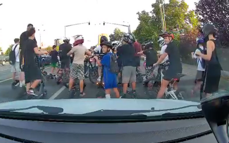În imagini se observă cum o gașcă de trotinetiști circulă cu viteză printre mașini, ocupând toate benzile.