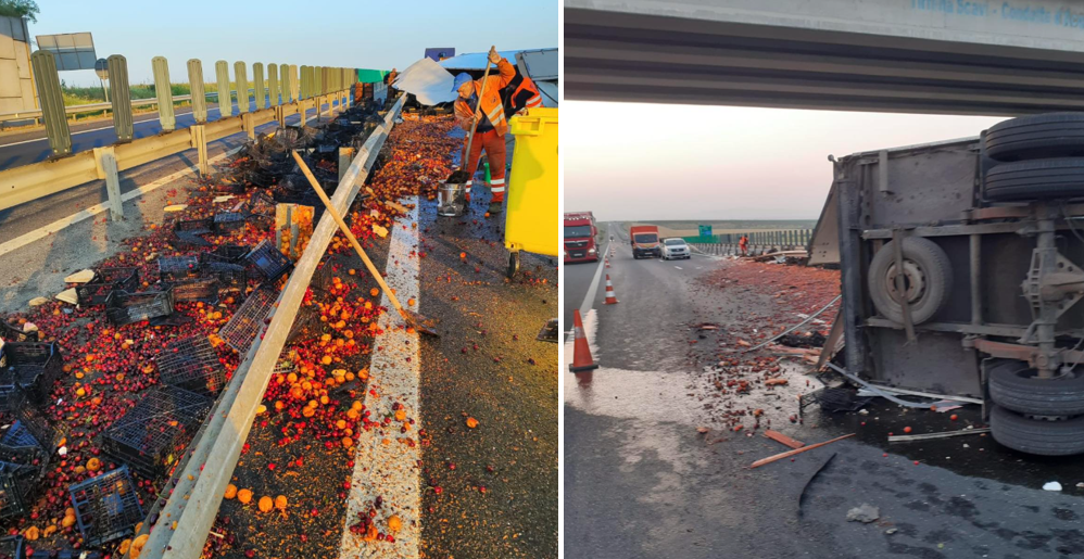 Un camion încărcat cu fructe s-a răsturnat pe autostrada A1, în apropiere de Timișoara! Se circulă cu restricții