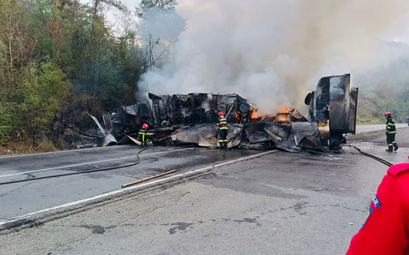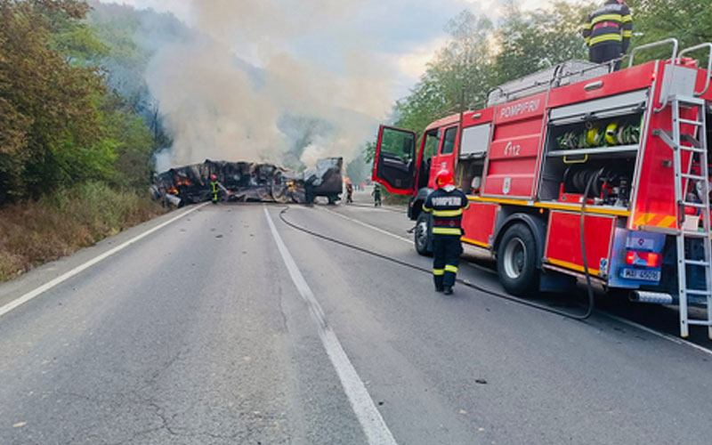 Un tir s-a făcut scrum, pe o șosea din vestul țării! Doi pasageri au avut nevoie de asistență medicală