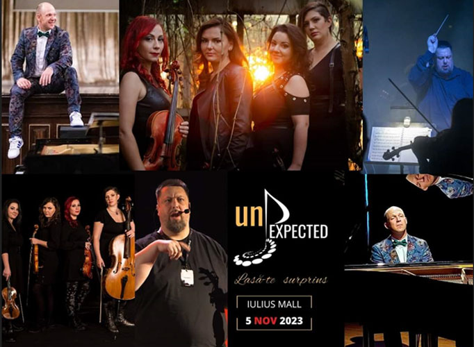 Concertul UNEXPECTED va avea loc la Sala de Eveniment Iulius Congres Hall de la Iulius Mall și va aduce pe scenă muzica clasică, muzica rock, umor și multă relaxare. Publicul va experimenta o interpretare inedită a artiștilor invitați, va putea interacționa cu ei, într-o atmosferă elegantă, selectă, dar în același timp nonconformista și deosebit de prietenoasă.