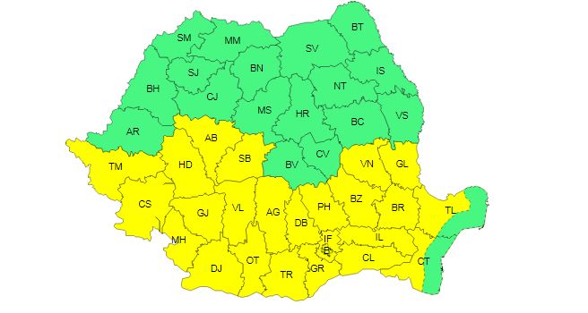 Astăzi este în vigoare un cod galben pentru mai multe județe din sudul Banatului, Oltenia, nord-vestul Munteniei și sud-vestul Transilvaniei. Aici se vor înregistra temperaturi deosebit de ridicate pentru această dată (maxime de 34-36 de grade) și local va fi caniculă.