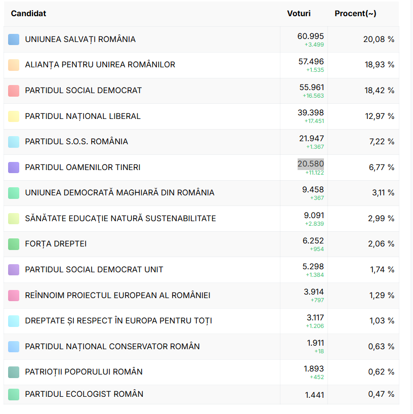 Situația este similară și la Camera Deputaților, unde USR este pe primul loc, cu 59.444 voturi (19,59%), urmată de AUR, cu 55.752 (18,38%) și de PSD, cu 54.713 voturi (18,03%).