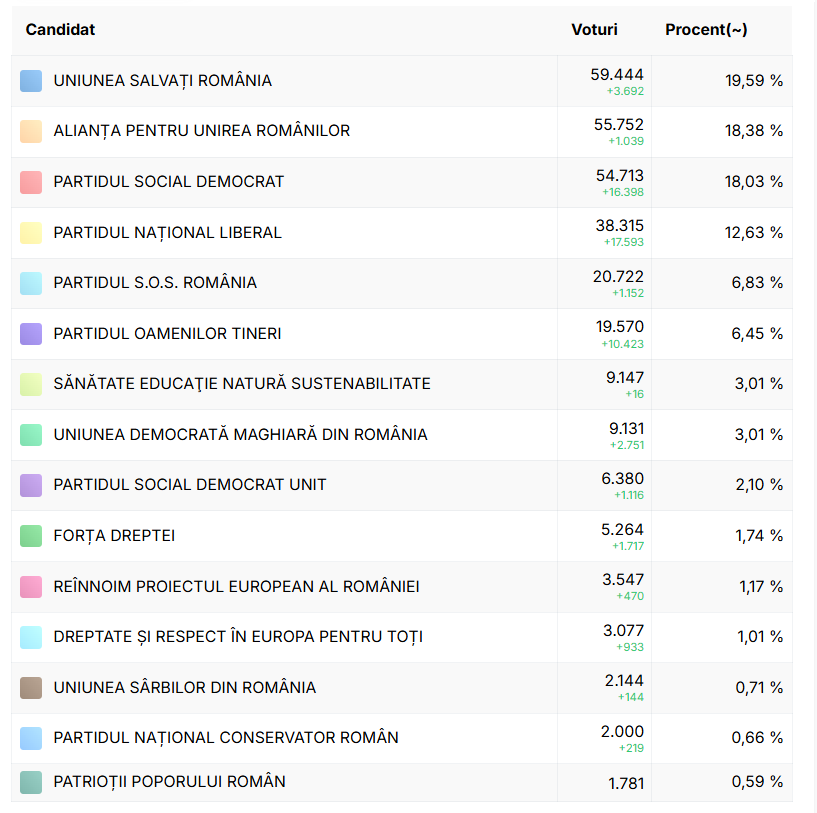 PNL are 39.398 de voturi (12,97%), SOS – 21.947 (7,22%), iar POT – 20.580 (6,77%).
