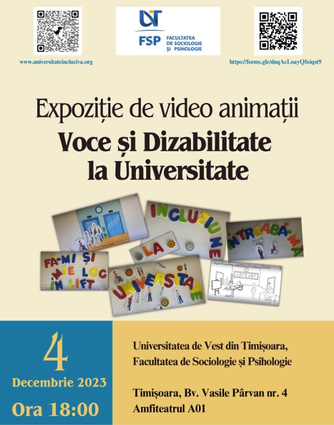 Timișorenii, invitați la lansarea expoziției de video-animații „Voce și dizabilitate la Universitate”, organizată cu ocazia celebrării Zilei Internaționale a Persoanelor cu Dizabilități.