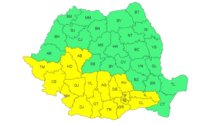 ANM a emis un cod galben valabil pentru ziua de astăzi, iar vizate sunt mai multe judeţe din sudul ţării. Mâine însă, valul de căldură se extinde şi cuprinde şi judeţele din vestul ţării.
