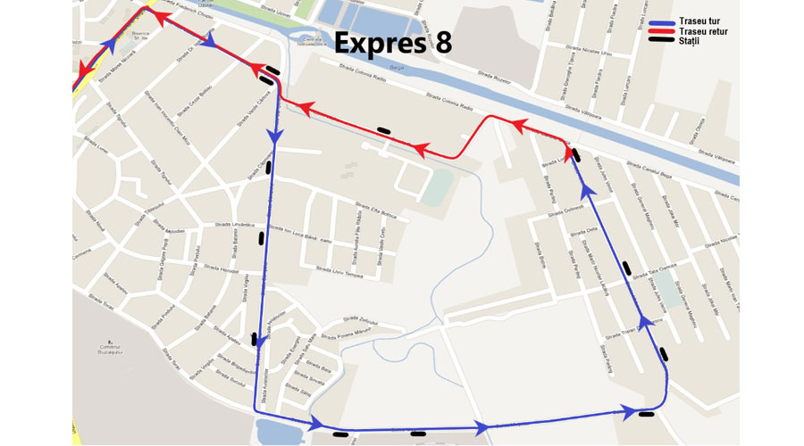 Linia Expres 8: strada Iosif Vulcan – strada Câmpului – strada Torac – Calea Moșniței – strada Albăstrelelor – Canal Bega – strada Rudolf Walter – strada Câmpului – strada Iosif Vulcan.