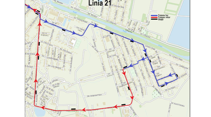 Linia 21: strada Iosif Vulcan – strada Rudolf Walter – Canal Bega – strada Martir Cornel Popescu (1918) – strada Parcului – strada Iosif Costinaș – strada Cocorilor – strada Martir Cornel Popescu (1918) – strada Tincu Velea – strada Tata Oancea – strada Albăstrelelor – Calea Moșniței – strada Câmpului – strada Iosif Vulcan.