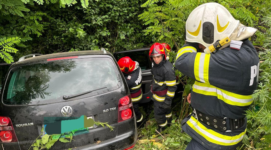 Victimă încarcerată, după ce o maşină a căzut în râpa de pe marginea drumului!