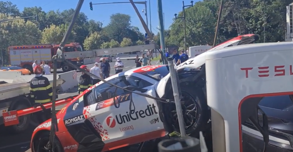 Una dintre mașini, un Audi R8 GT3, a ieșit în afara pistei și a lovit în plin o Tesla care era parcată în stația de încărcare din apropiere.