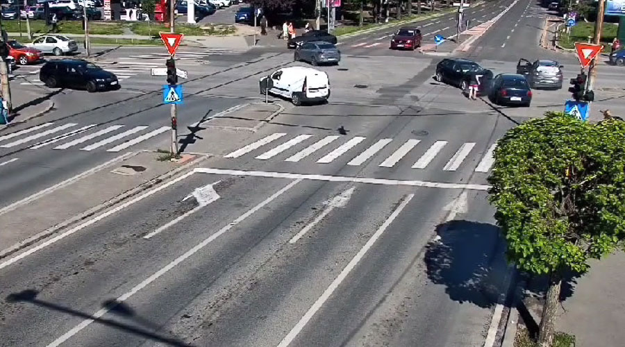 Video: Accident violent, filmat într-o intersecţie din Timişoara! Trei maşini avariate, după ce o tânără şoferiţă nu a acordat prioritate