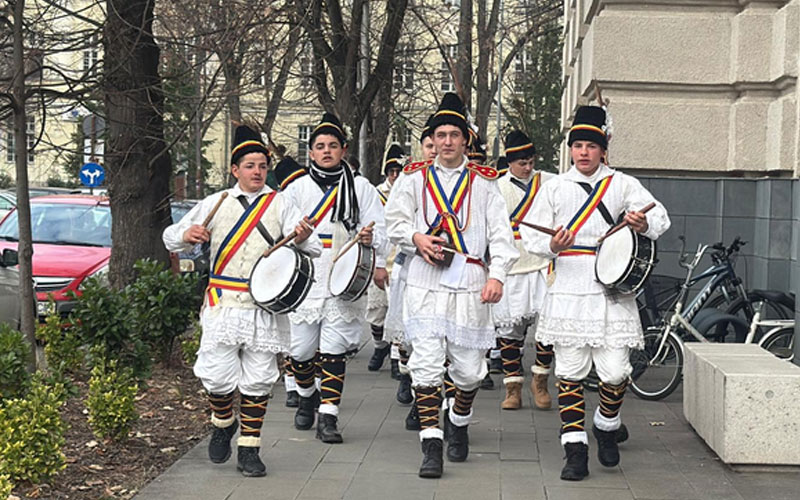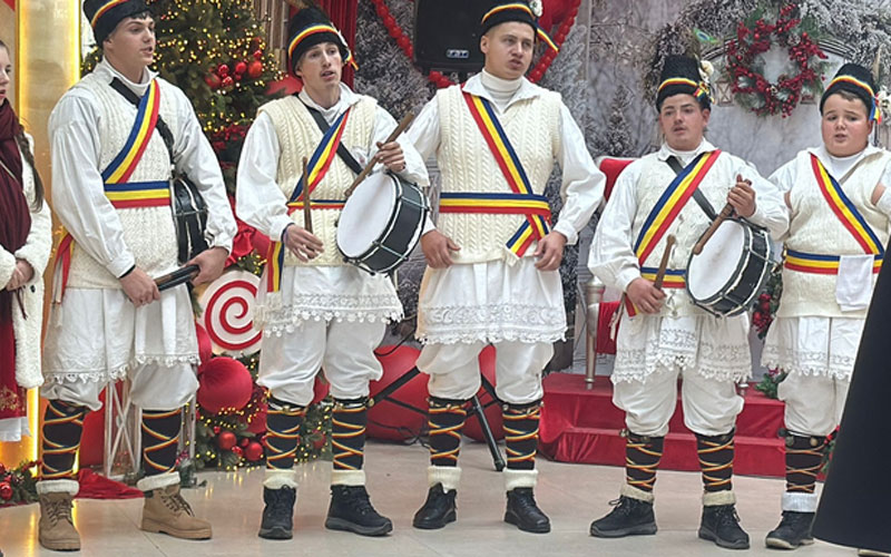 Îmbrăcați în straie populare ca odinioară, colindătorii vestesc speranța și belșugul, pe ritmul ancestral al dubelor.