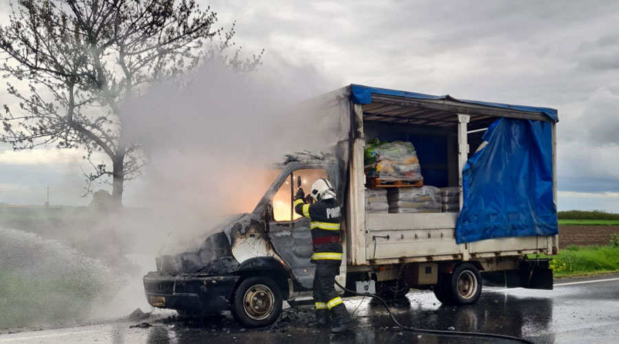 La sosirea echipelor de intervenţie, flăcările se manifestau violent la cabina autoutilitarei şi ameninţau să se extindă.